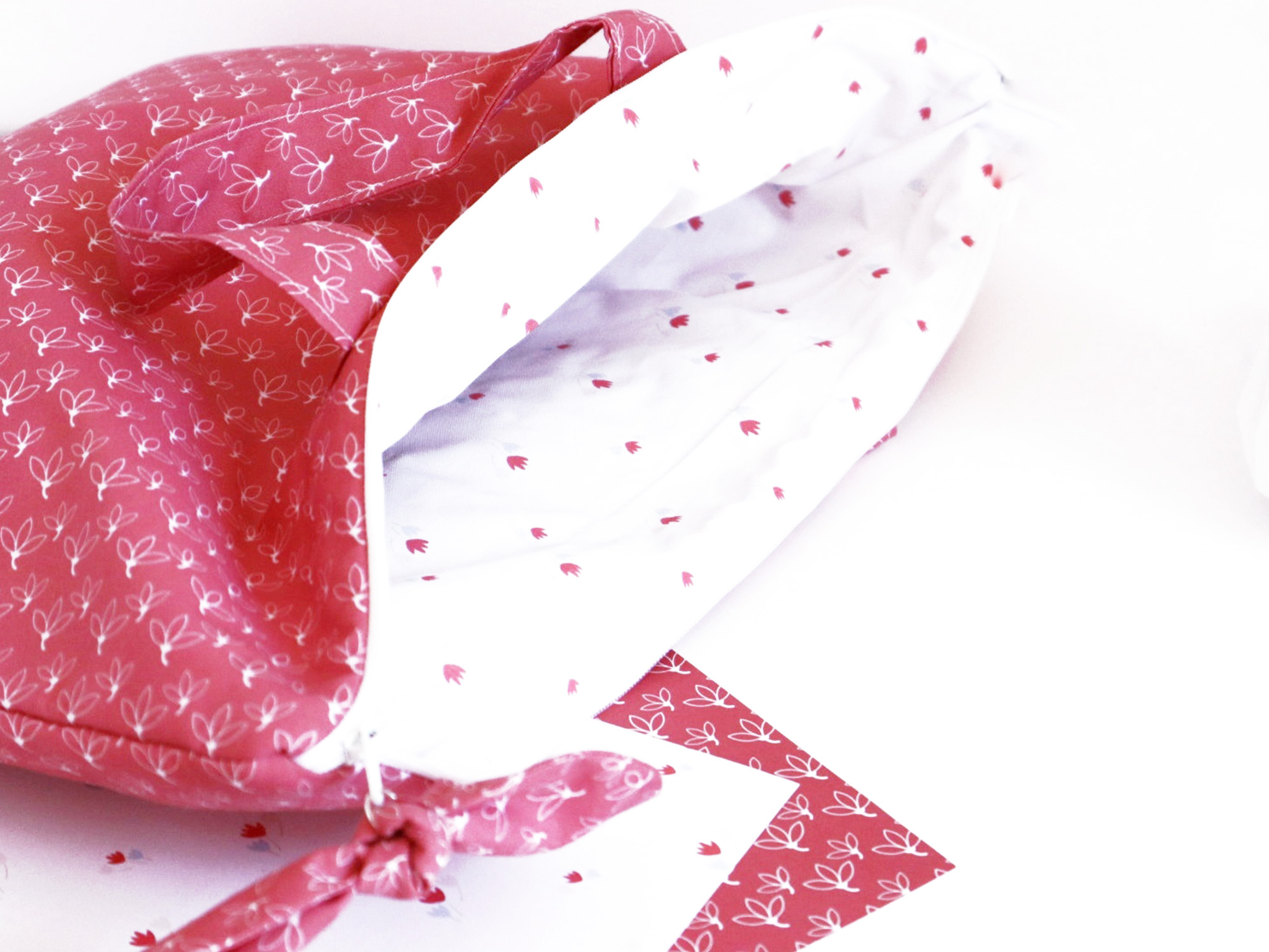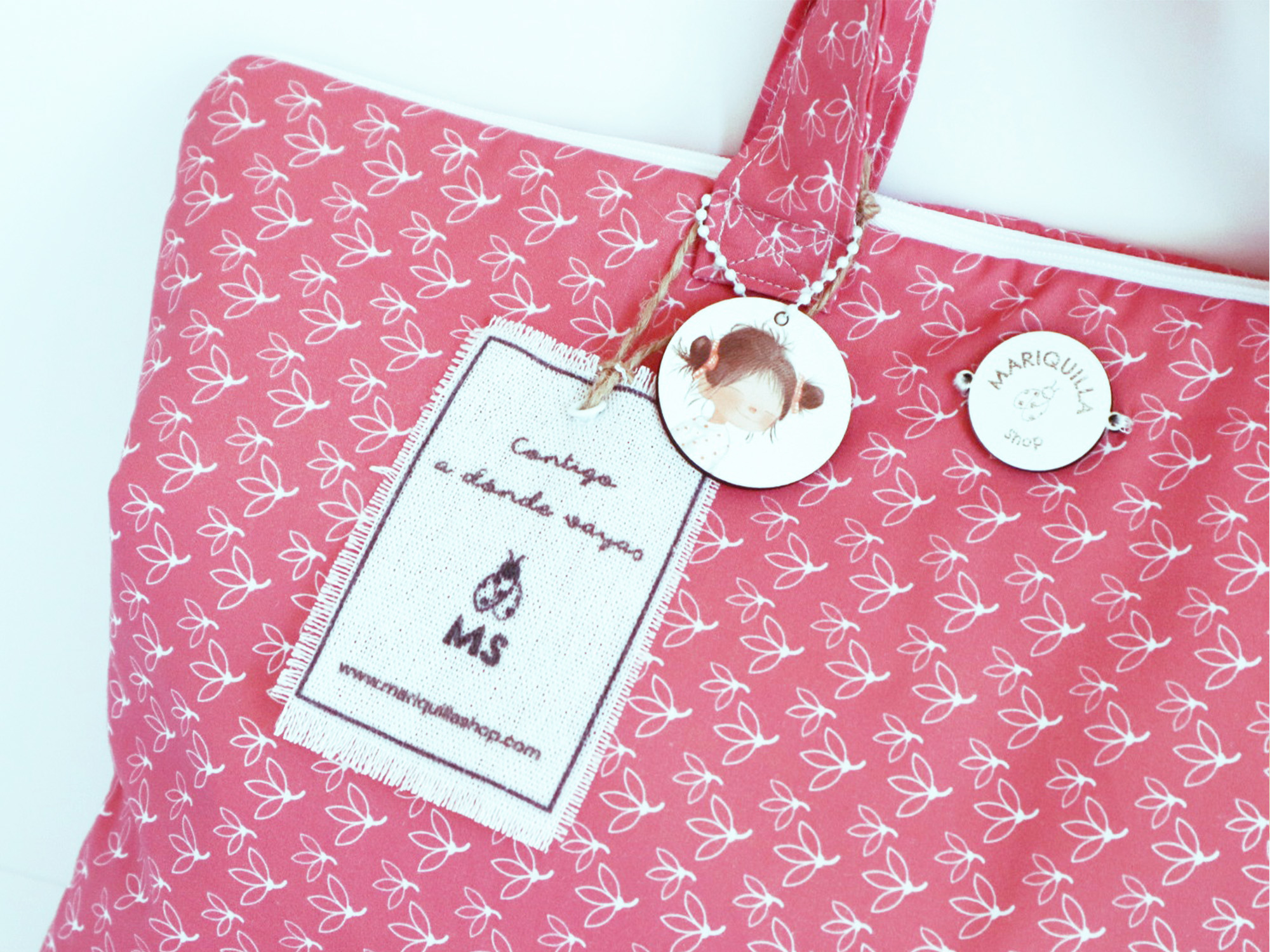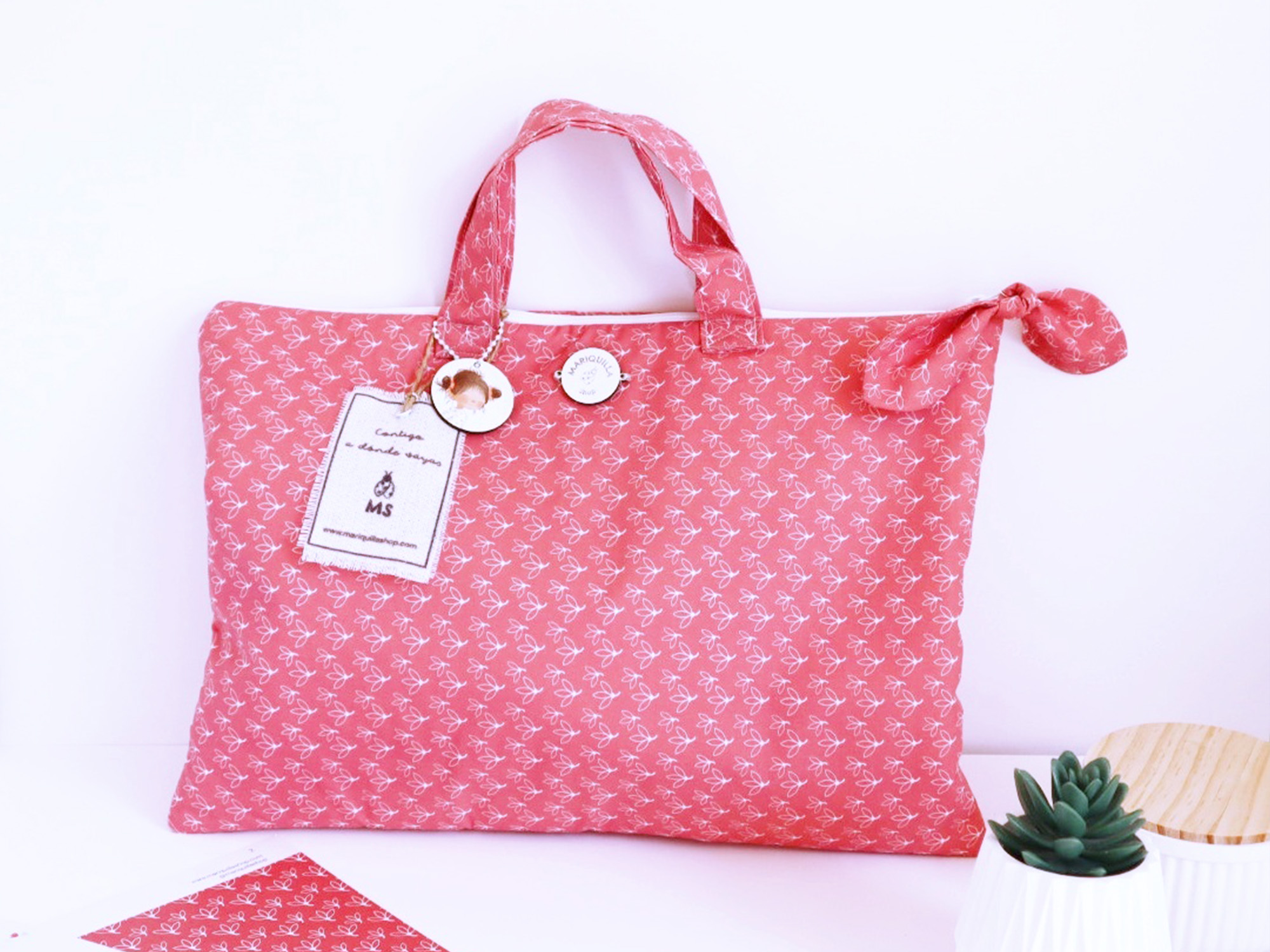 Esta bolsa coral está confeccionada en algodón con telas diseñadas por mí, pensada para cuidar tu portátil con dulzura y estilo.