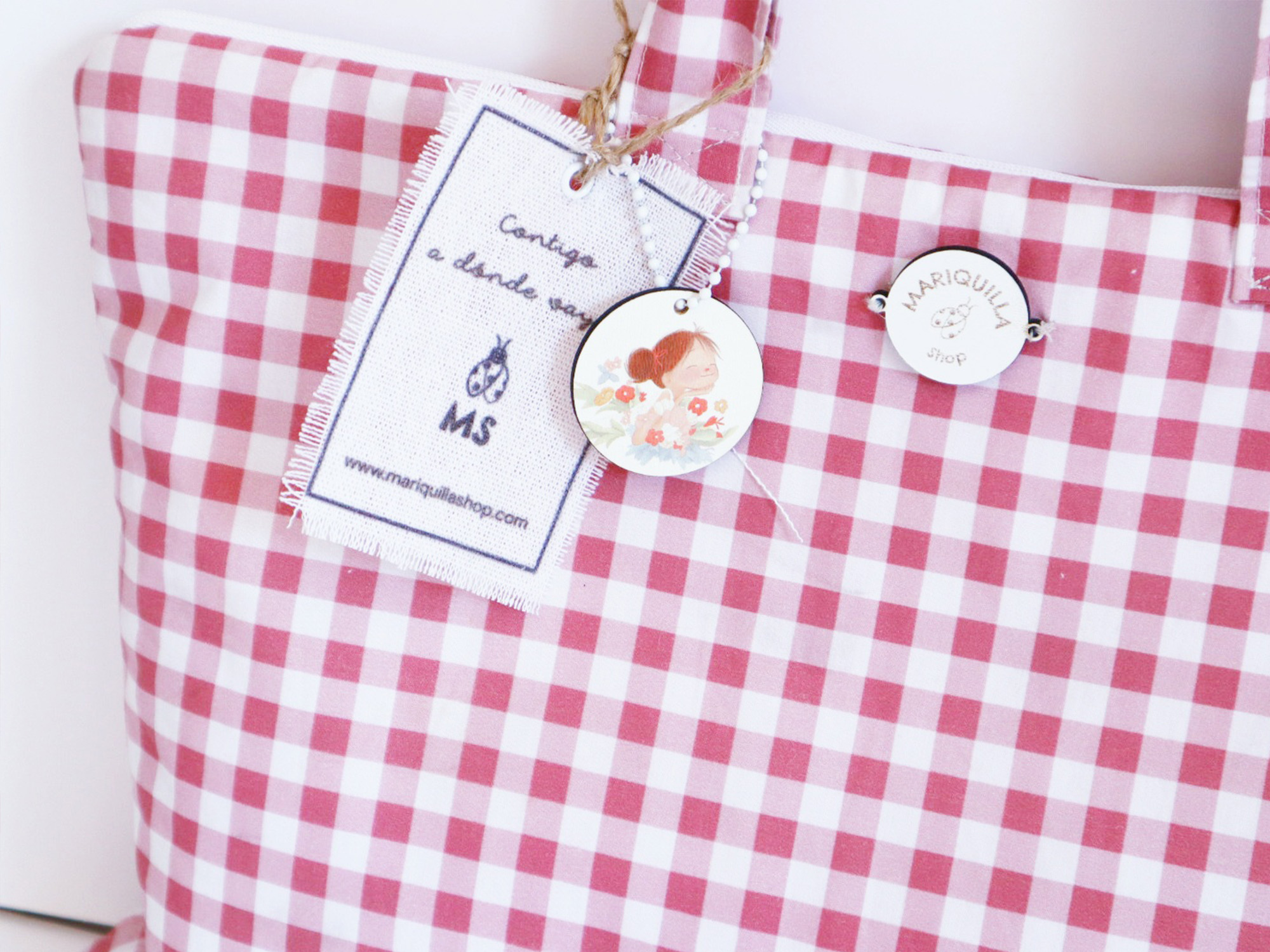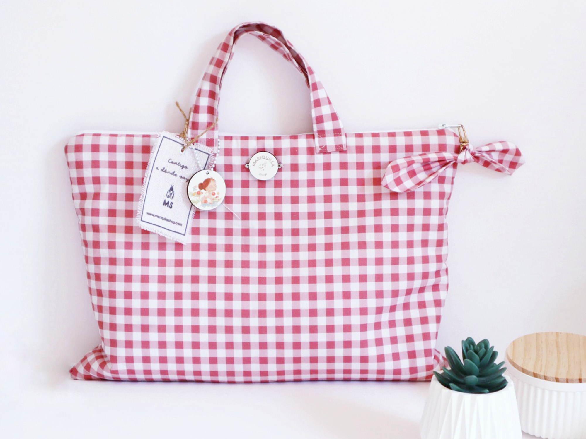 Diseñada para acompañarte en tus días creativos, esta bolsa de algodón con estampado vichy ha sido confeccionada con mucho mimo, a mano una por una y nuestras telas exclusivas.