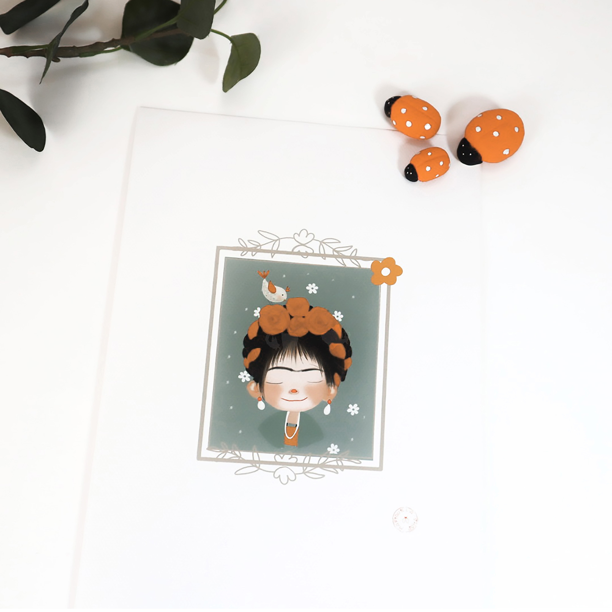 Si Frida Kahlo te inspira, prepárate para enamorarte de Fridiquilla, la versión más tierna y juguetona de la icónica artista. Con sus flores en el cabello, sus ojos cerrados y una simpática avecilla como compañera, Fridiquilla está lista para llenar de color y personalidad cualquier rincón de tu hogar.