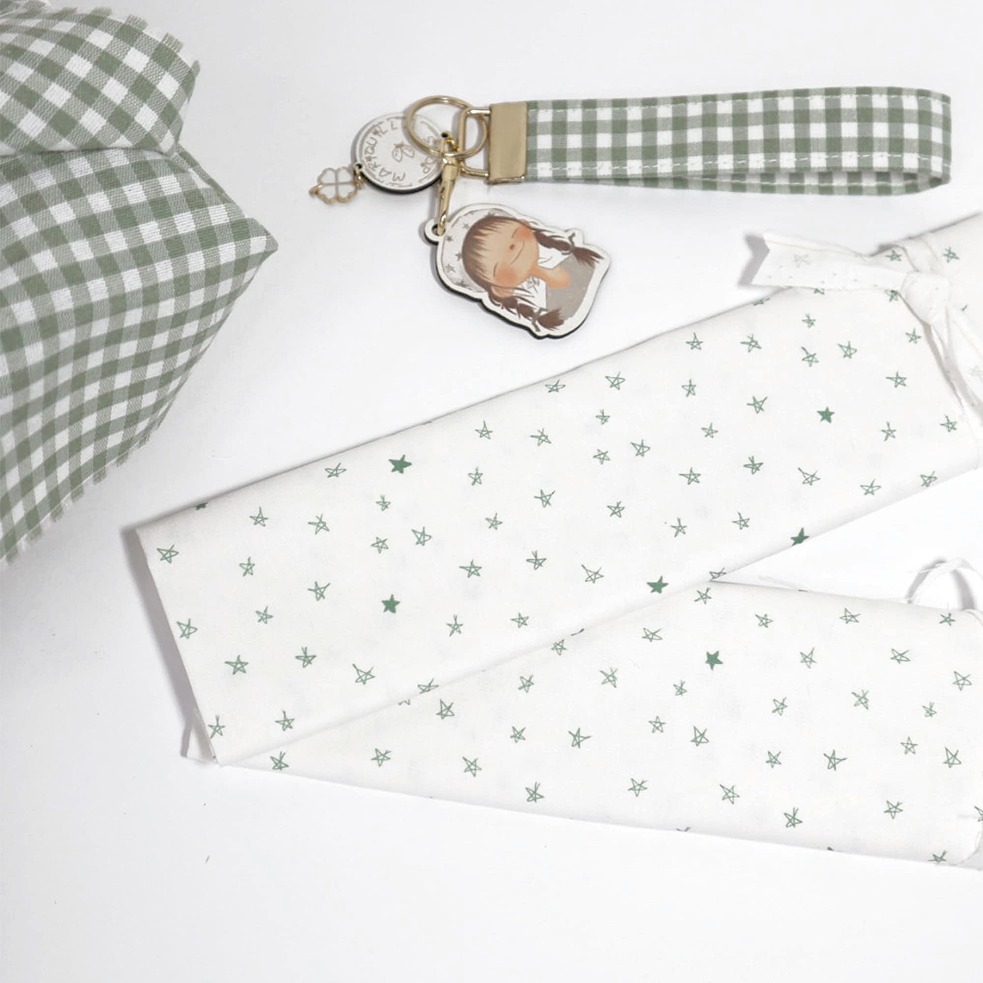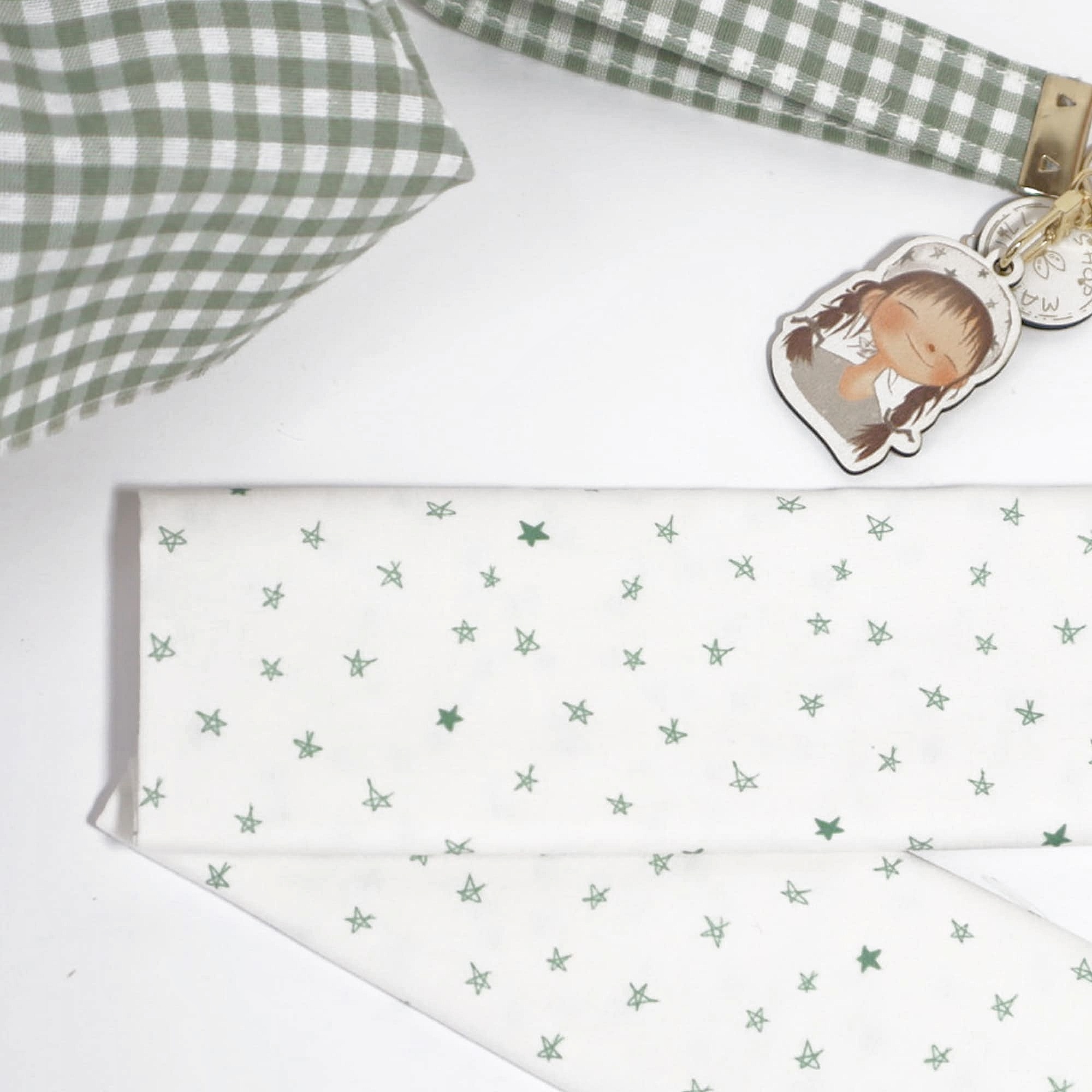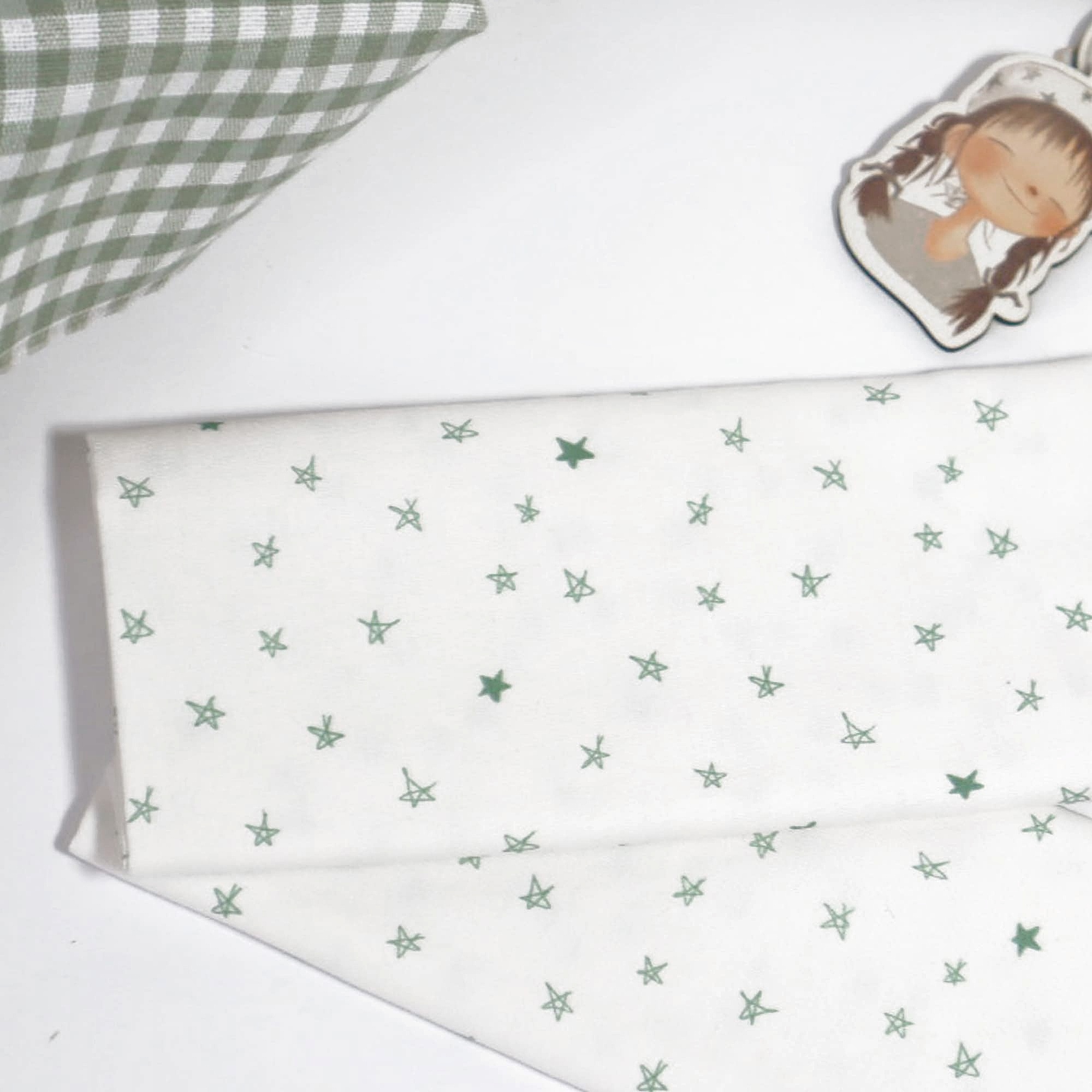 “Bajo este cielo de estrellas, los sueños se vuelven realidad y la noche se viste de magia.” Esta tela pertenece a Destino Felicidadl leva un patrón de estrellas en tonos verdes sobre un fondo blanco.